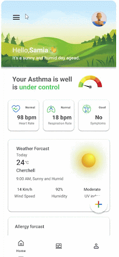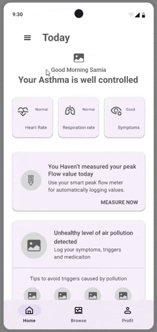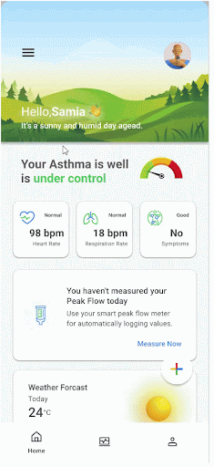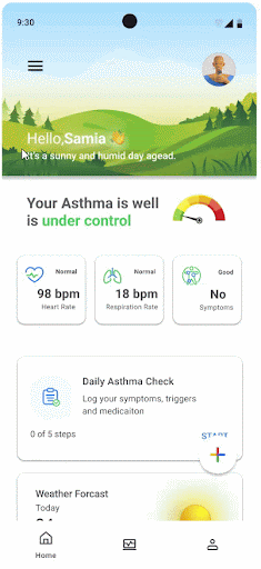 Participants will begin by selecting their user type: careseeker or caretaker. For this test, assume the participant selects the careseeker option. They will then specify their type of asthma and identify triggers. Participants will have the option to pair the Google Aria smart devices (smart inhaler and smart peak flow meter) and explore the home page afterward that contains personalized insights and detailed data about all their vitals.